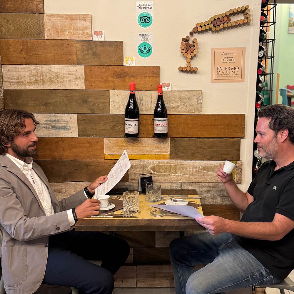 La forza dell’Enosteria Sicula è l’equilibrio tra due anime complementari. Massimo è l’anima creativa: cura i dettagli, l’identità del locale, la comunicazione online e la coerenza visiva del brand. Da grande appassionato di vini, cura anche, con estrema attenzione, l’assortimento della nostra cantina. Piero è l’anima operativa: ama i fogli excel, quindi supervisiona la gestione economica, la logistica, pianifica ogni aspetto e cura in prima persona i rapporti con i fornitori. Trasforma un’idea in un progetto stabile e solido. Insomma, uno crea la mappa, l’altro trova il percorso. In mezzo, noi, voi e l’Enosteria Sicula.